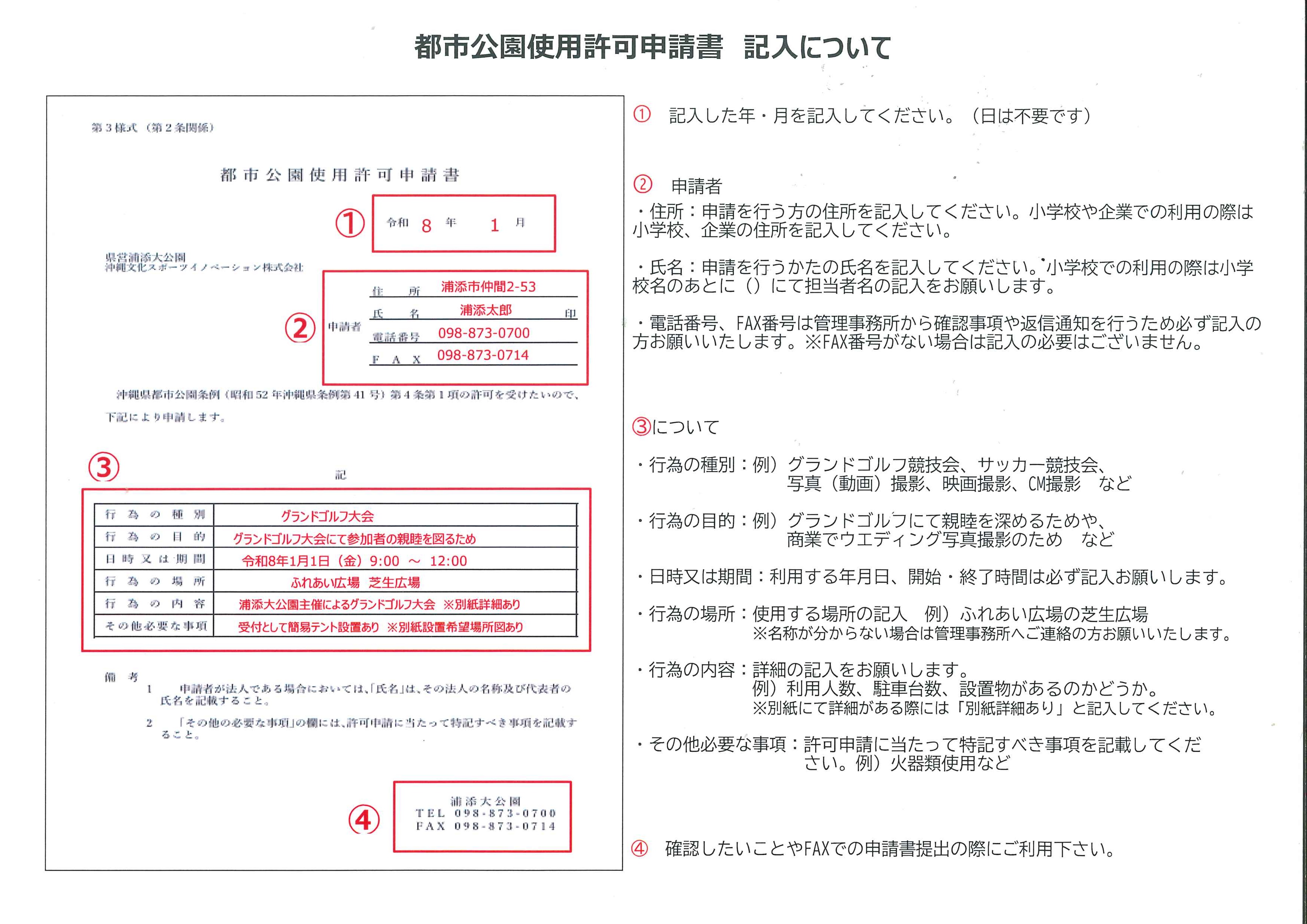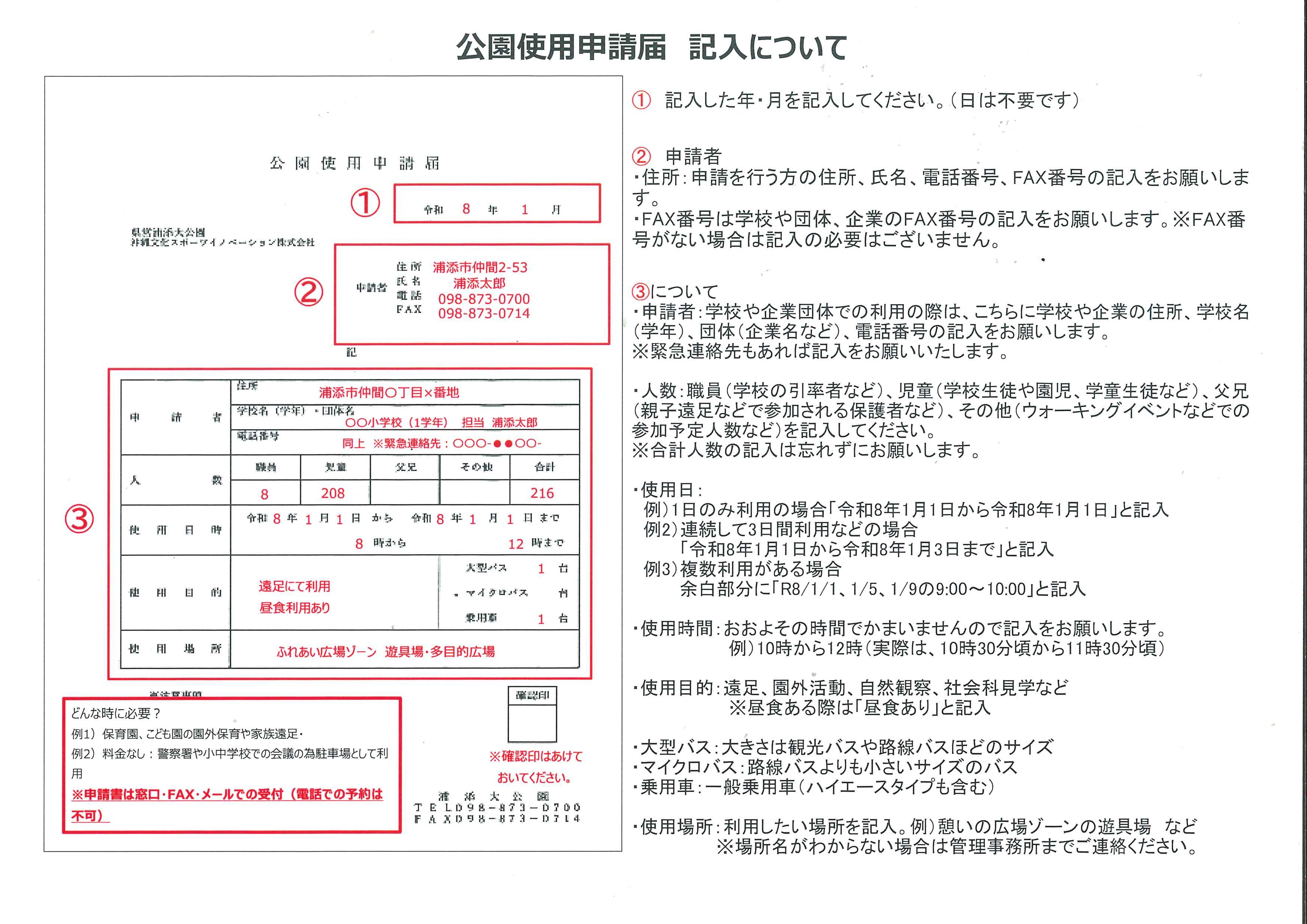 〇浦添大公園内大型バス駐車場(マイクロバス含む)が限られており、利用予約状況によっては大型バス、マイクロバスの駐車ができない場合がございます。そのため空き状況を事前確認し「公園使用申請届」の提出をお願い致します。