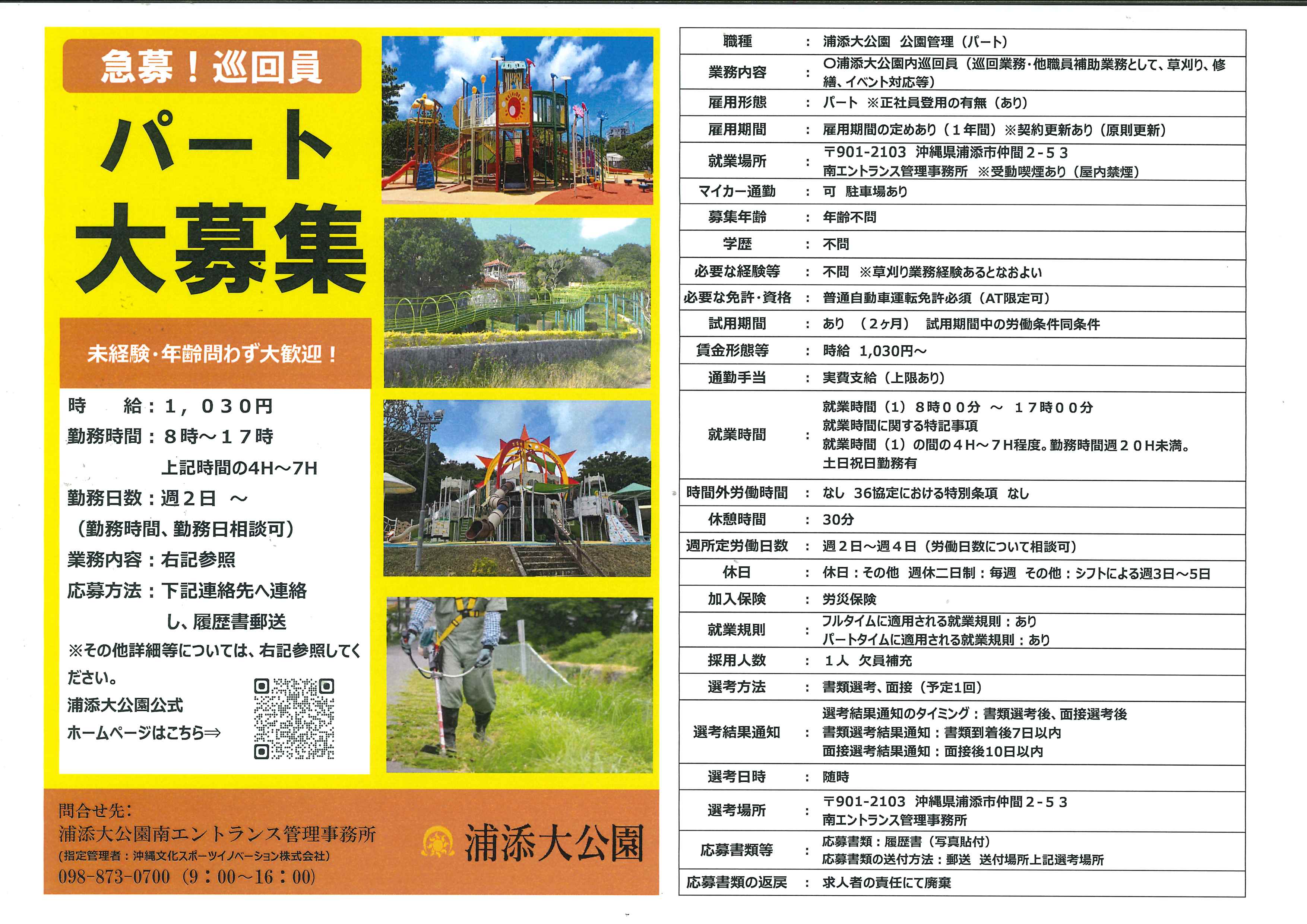 浦添大公園巡回員パート募集中です。※詳しくはこちらをクリックしてください。→ 募集要項