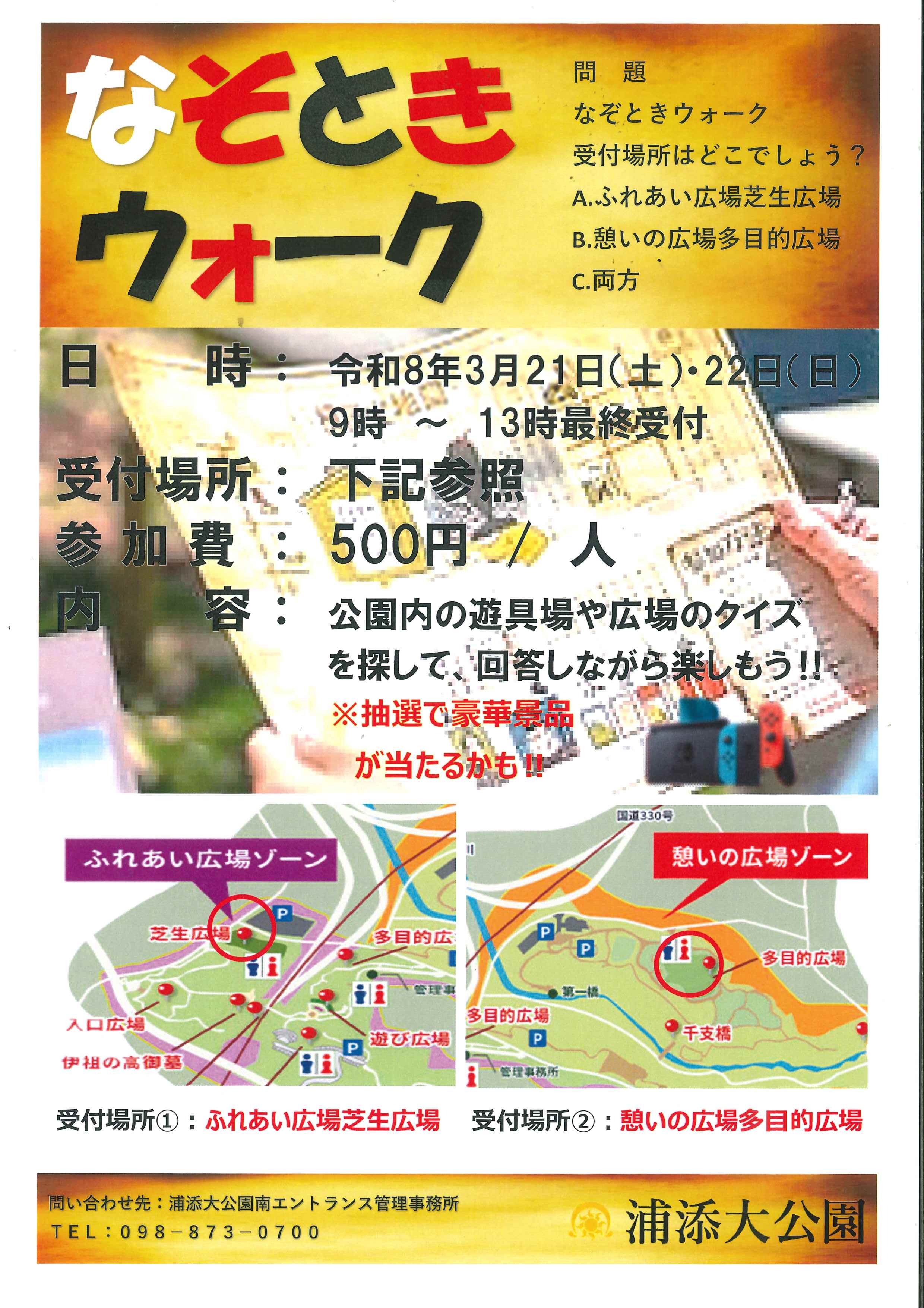 令和8年3月21日(土)・22日(日)浦添大公園ふれあい広場ゾーン・憩いの広場ゾーンにて「なぞときウォーク」開催。ご家族、個人どなたでもご参加お待ちしています。また、イベントに伴いキッチンカー出店応募の方も受付しております。