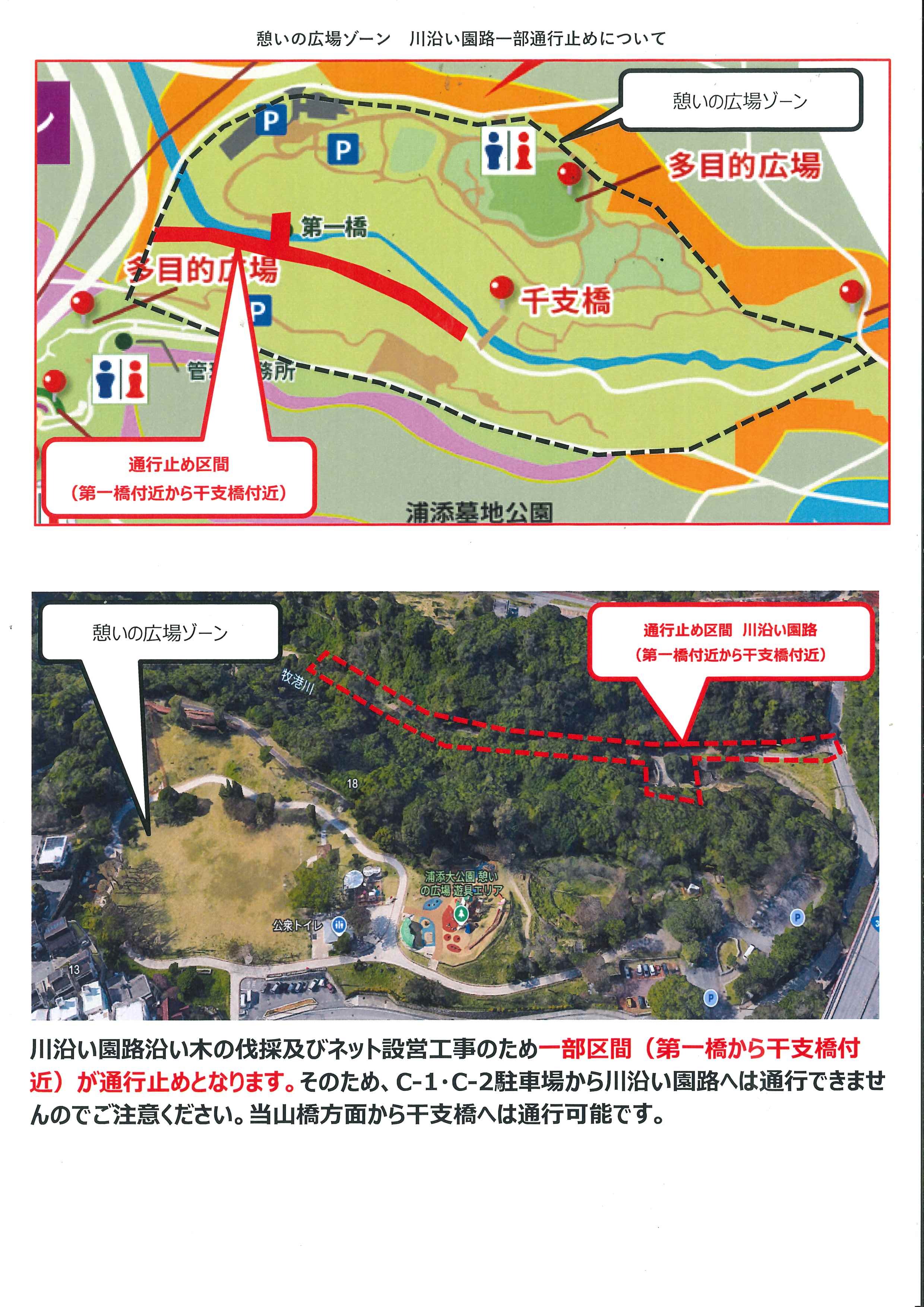 平素より浦添大公園をご利用いただきありがとうございます。令和7年9月8日(月)から浦添大公園内の川沿い一部区間(第一橋から干支橋付近)伐採及びのり面工事のため通行止めになりますのでお知らせいたします。※詳しくはこちらを。